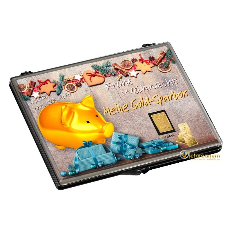 Diese GOLD-SPAR-BOX von Heimerle & Meule bietet Platz für fünfzig 1 Gramm Goldbarren. Alle Barren können einzeln in die Box gelegt werden und sind durch Polsterung vor Schäden geschützt. Hier erhalten Sie die Box als Valentins-Edition bereits mit einem 1 Gramm Goldbarren von Heimerle & Meule gefüllt. Die einzelnen 1 Gramm Barren können Sie jederzeit bei uns zu einem fairen Preis nachkaufen. Daher eignet sich die GOLD-SPAR-BOX hervorragend als Geschenk für Ihre/Ihren Liebste/n. Wem man einmal die GOLD-SPAR-BOX geschenkt hat, kann man von nun an zu jedem festlichen Anlass mit einem weiteren 1 Gramm Goldbarren beglücken.